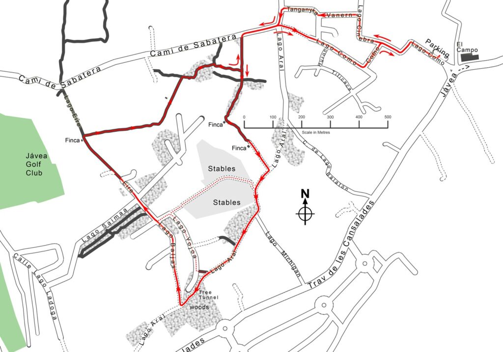- At the other end of the “tunnel”, take the track on the right. This is Calle Lago Baljas (often marked on maps as Baljash). Walk along this track past a new house on the left and then the track becomes a tarmac-ed road. The stables are just visible to the right through the fence.
