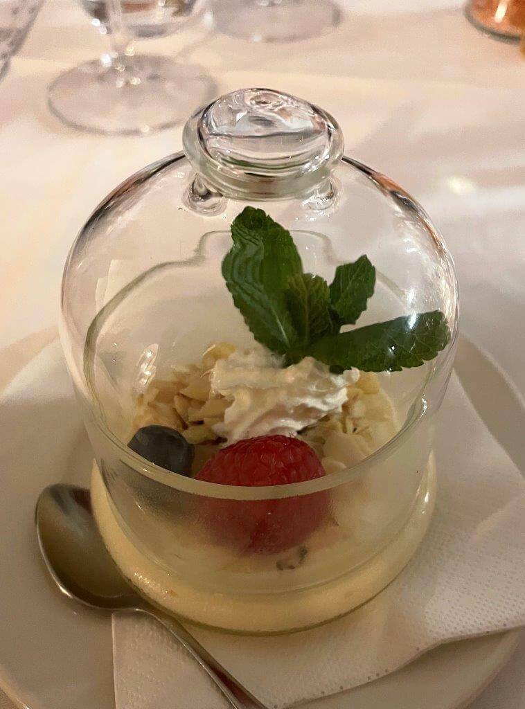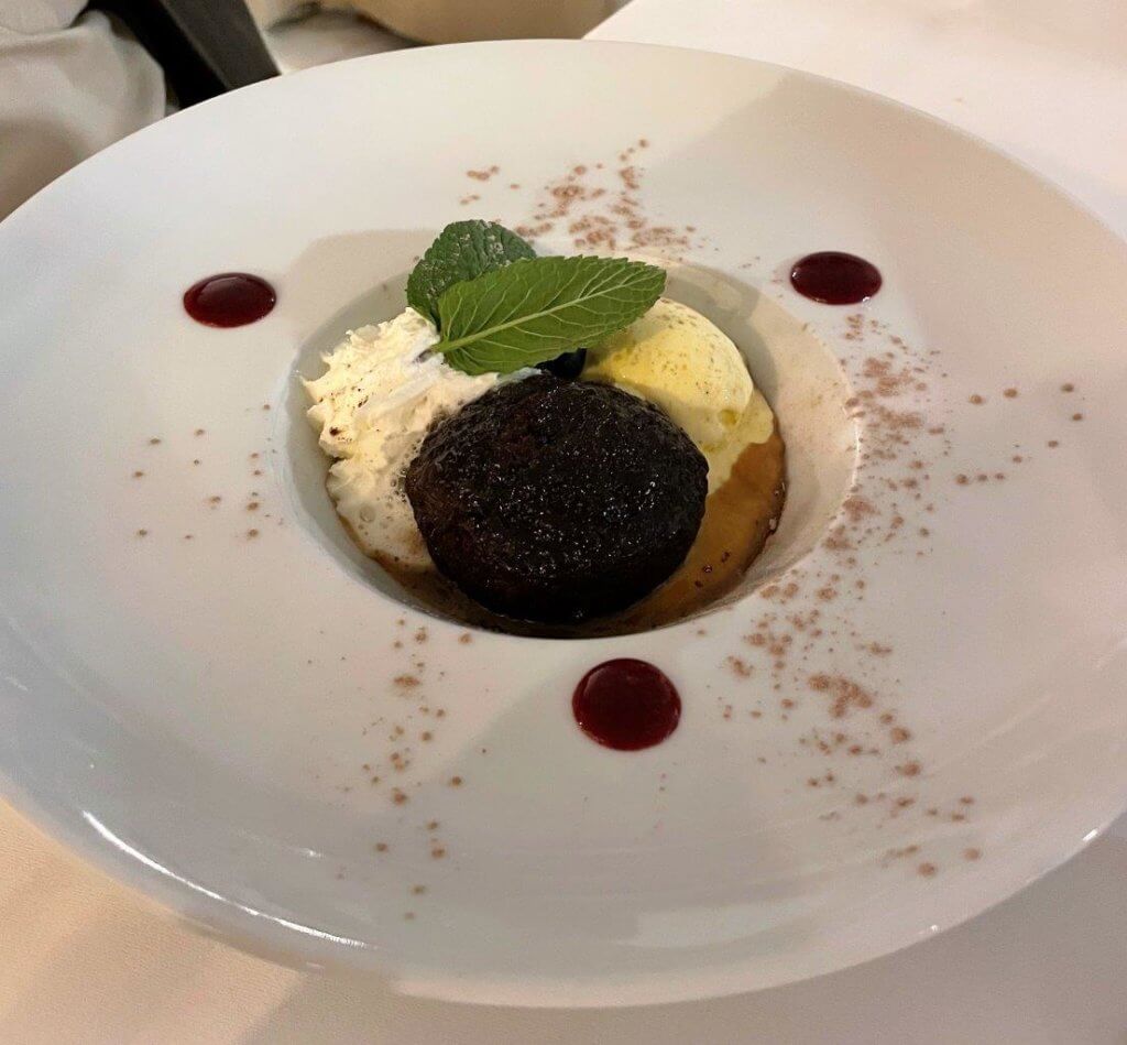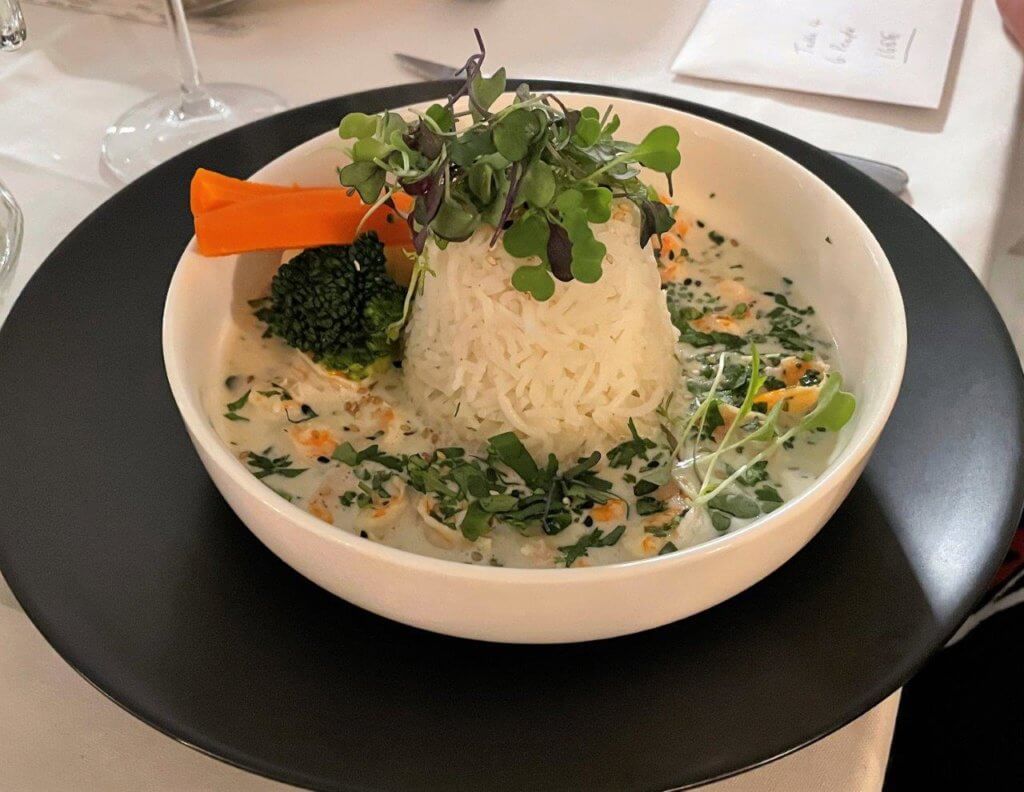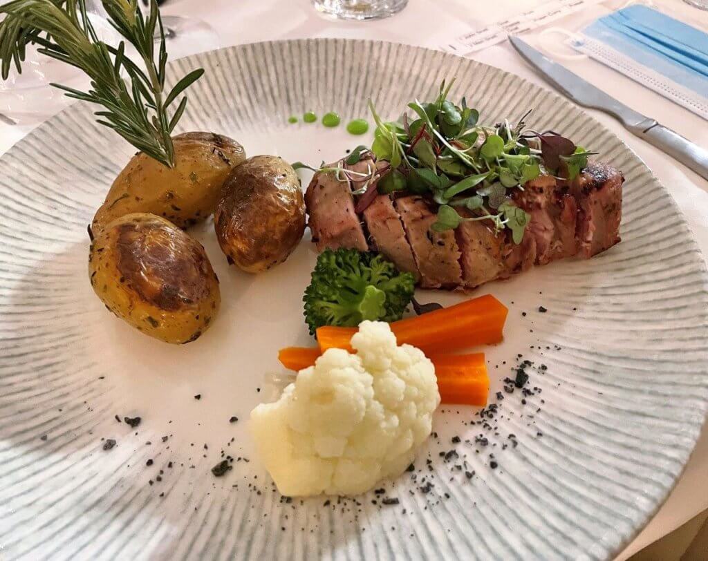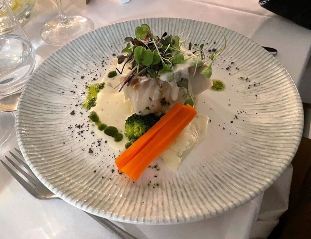After arriving, everyone was offered a welcome glass of cava. To start, diners could choose from a home made chicken liver pate, warm sesame goats cheese, a spiced fishcake, all served with different chutneys and salad, or a delicious tomato and basil soup. After a refreshing sorbet, perfectly cooked cod, boneless lamb, iberico pork loin or a choice of three Thai green curries were offered as main courses. A white chocolate cheesecake, a delicious mango and passion fruit posset or the ever popular sticky toffee pudding rounded off a delightful meal. Those who were already stuffed full after the main course could opt for a liqueur coffee instead.