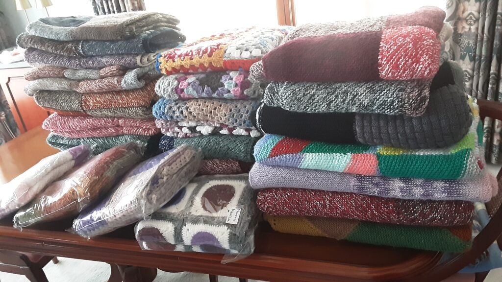 We produced 30 blankets, so we needed to find a charity to use them. Through a friend, we heard that the Ukranian Group in Denia were able to send warm clothes to the homeless and needy in the war zone. They were delighted to receive the blankets, which were sent to keep soldiers and orphaned children warm, in their cold winter.
