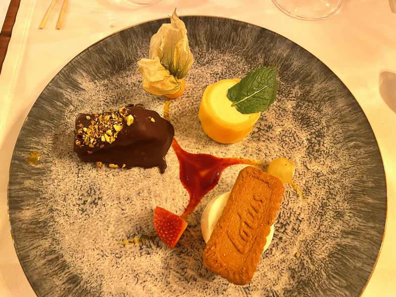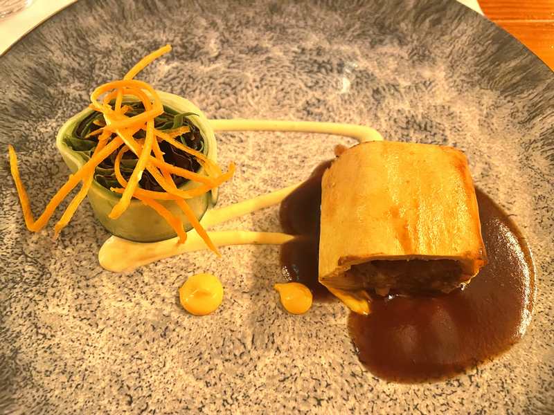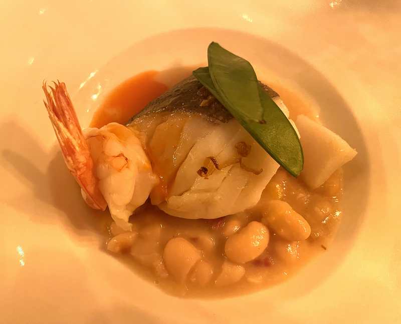 Maxim provided a tasting menu of 5 courses for us, so there were no difficult menu choices to make. As usual, there was a welcome glass of cava, before 62 hungry diners settled down to their tables for the meal, with a house tapita and bread and aioli to begin with. There followed 2 starters: first a dish of 3 langoustines on an apple mille-feuille and walnut praline, followed by what was described as a beef and pork pie. The pie was more like a slice of a large sausage roll, with lovely crisp pastry and a Gloucester sauce. After a pause with a refreshing lemon sorbet, the fish course of a superbly cooked tender piece of Icelandic cod with piquillo pepper sauce and haricot beans was served, followed by a meat course of suckling pig terrine with seasonal vegetables. We finished with 2 desserts on one plate, so I guess we had 8 fairly small courses in all.