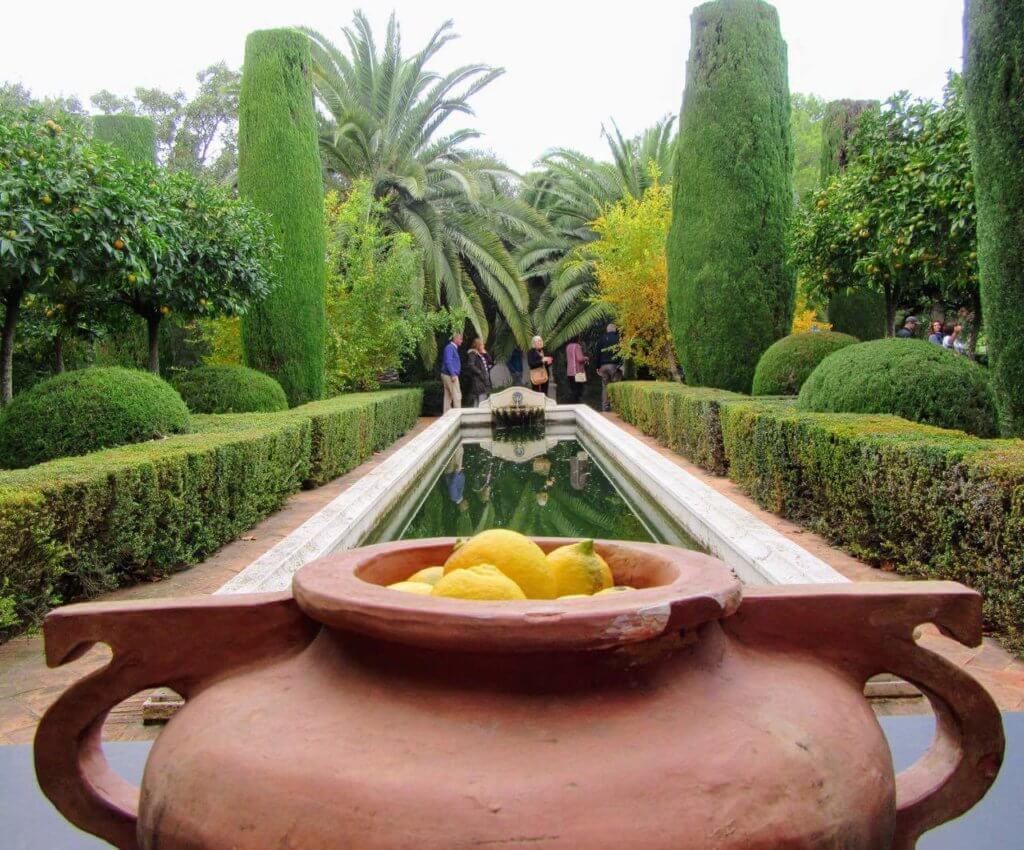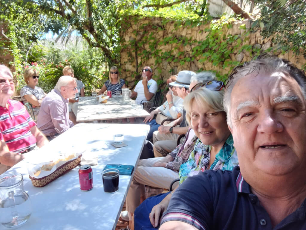 grow organically using less water. The garden is divided into four main areas, each with its own identity. Formal, wild as well as areas with Spanish and Arabic influences. There are beautiful structures and water features including an impressive waterfall. Each turn brings you something different and beautiful – if only we could remember the names of some of the flora.We travelled through time in the Arab garden, strolled over a stream, through woods, admiring the closely clipped myrtle hedges and the beautiful rose garden. We watched the Koi carp, took photos of the statues and sat in the large amphitheatre style building to admire the vast number of succulents in pots on every step. After passing a giant mosaic wall, we completed our tour back at the house. Although not open to the public, there is a seating area in a pretty courtyard where staff provided us with coffee, cold drinks, bread and more than enough tasty tortilla.