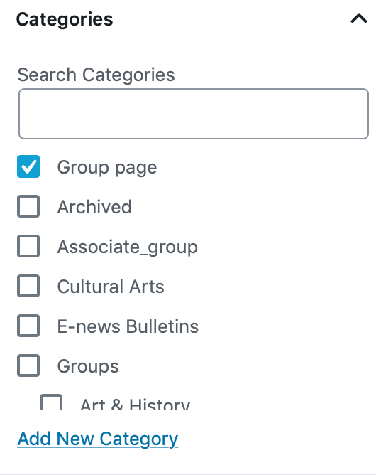 In the right column, under Categories, click on Group page – do NOT select other categories – this category will include the post in the correct place page on the Groups page: